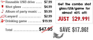 This is a shot glass with a removable USB that comes loaded with Ali Spagnola’s Power Hour Album of 60 one-minute drinking songs. Use the music to play a power hour drinking game! Just plug in the USB to play the songs, copy them to your computer, put them on an MP3 player or burn a CD. The USB is also reusable to store 1GB of data.